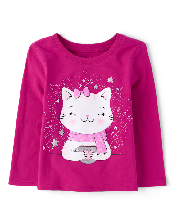 Blusa de algodón manga larga para niña marca Children's Place, cuello redondo, color rosa fucsia y estampado de gatita con bufanda tomando chocolate.