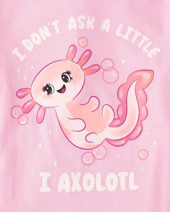 Blusa de algodón para niña marca Children's Place, cuello redondo, color rosa pastel, estampado de ajolote.