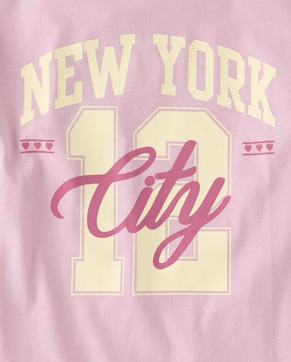 Blusa de algodón para niña marca Children's Place, cuello redondo, color rosa pastel y estampado juvenil de New York City.