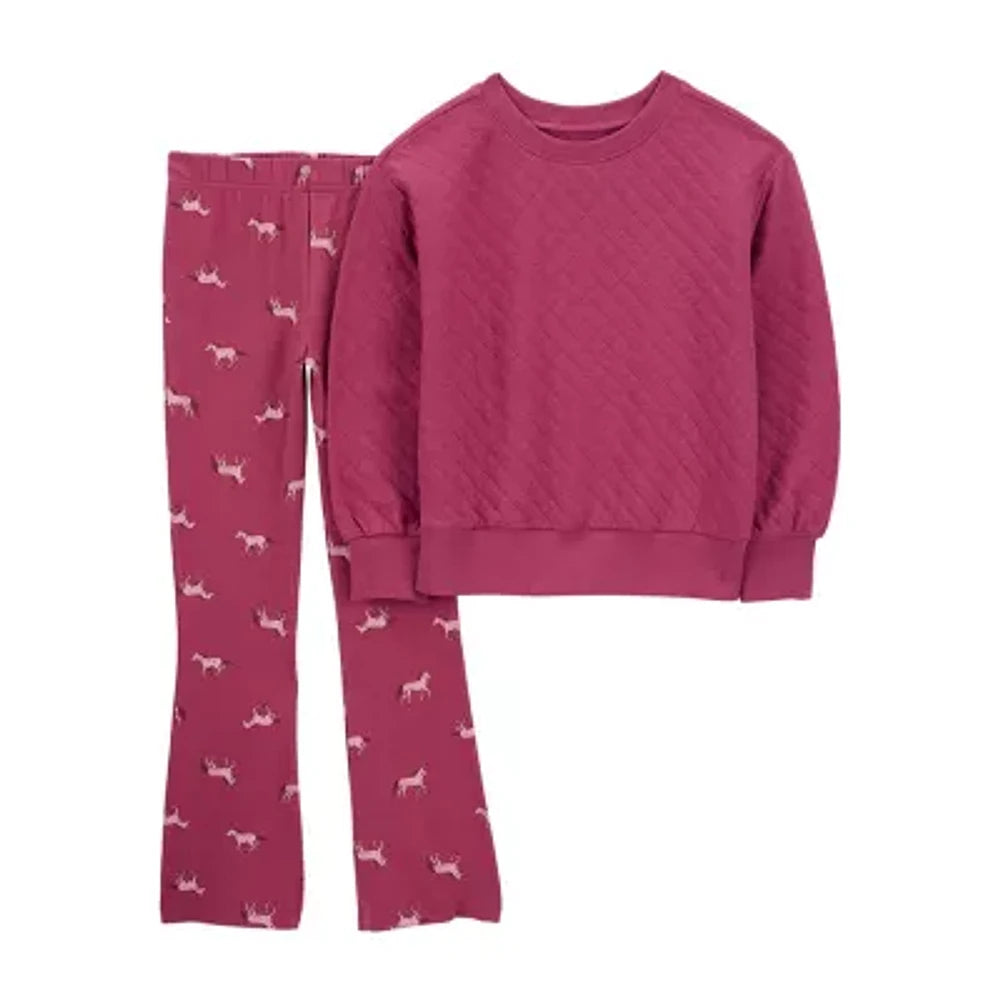 Conjunto de 2 piezas de algodón para niña marca Carter's, estampado de caballos en pantalón y blusa corrugada.