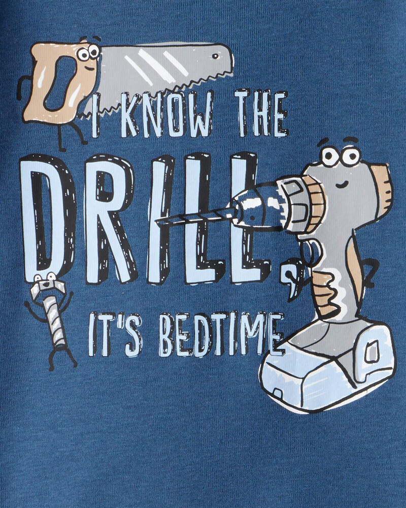Set de pijama de 4 piezas, de 2 pares de pijamas de algodón para niño marca Carter´s, combinación de colores azul y gris con estampado de herramientas.