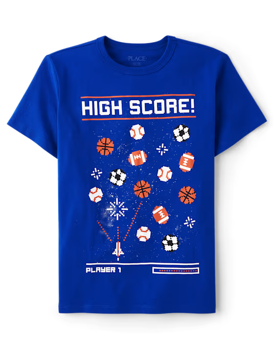 Playera de algodón para niño marca Children's Place. Color azul eléctrico y estampado de videojuego de balones deportivos.