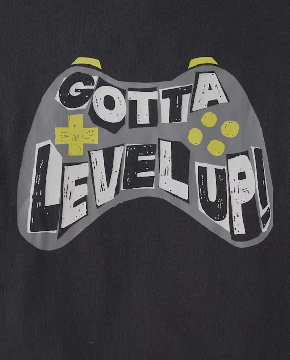Playera de algodón para niño marca Children's Place. Cuello redondo, color gris oscuro y estampado de control de videojuego.