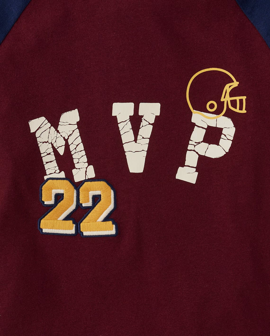 Playera de algodón para niño marca Children's Place. Color tinto y estampado de fútbol americano y MVP 22.