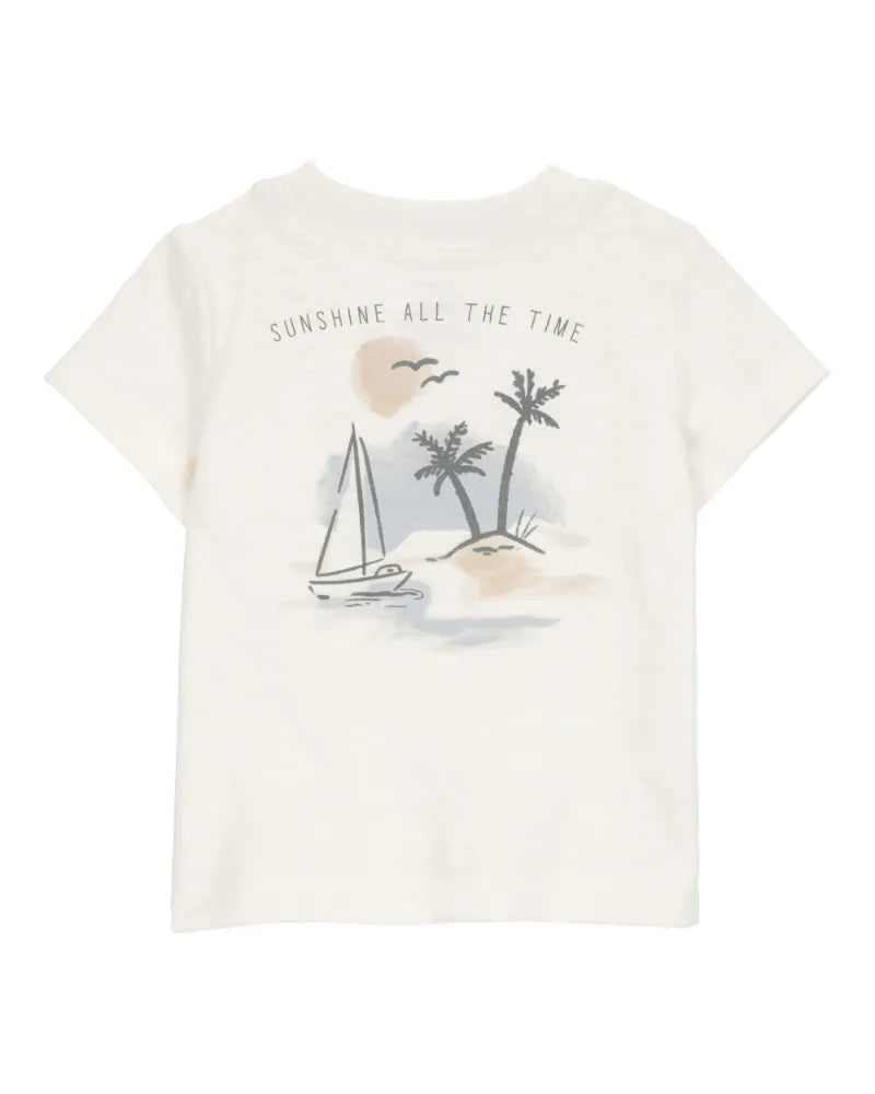 Set de 3 piezas de algodón para niño marca Carter´s,  camisa tipo mezclilla con botones en el frente, playera manga corta con estampado de playa por la parte de atrás y short color beige.
