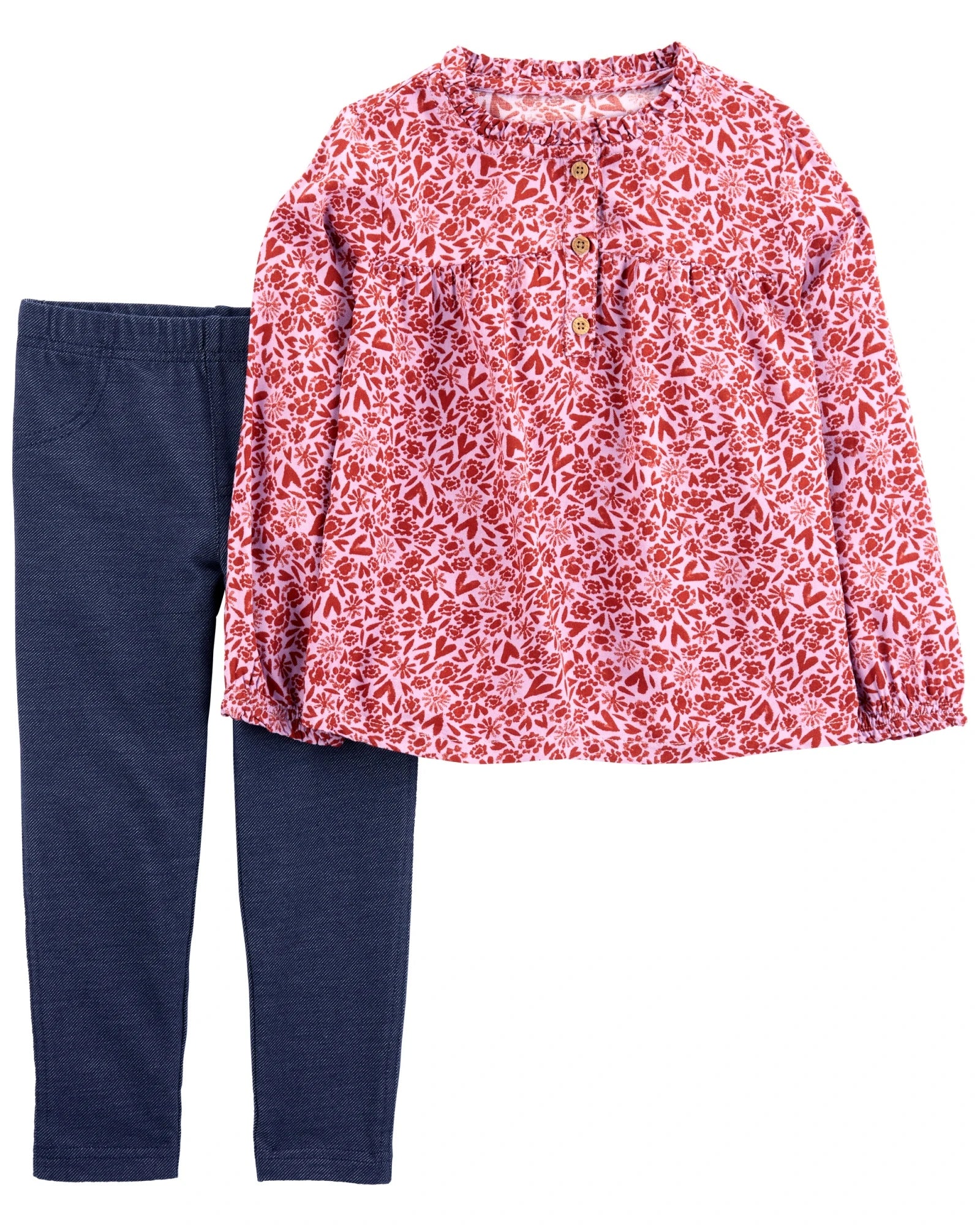 Set de 2 piezas de algodón de niña marca Carter's, blusa manga larga, detalle de botones en el pecho, estampado floral y puños con resorte.