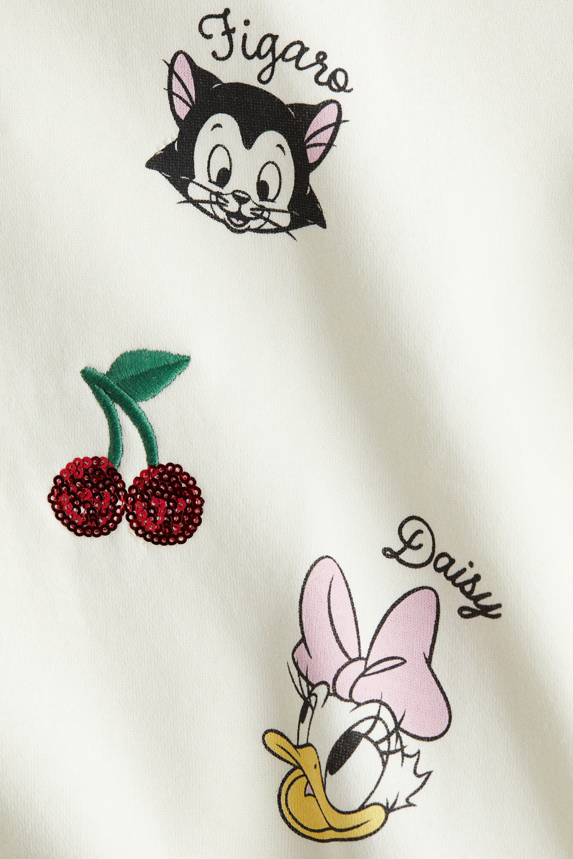 Sudadera de algodón para niña marca H&M, afelpada por dentro, estampado de caritas de Minnie Mouse, Daisy, Fígaro y cerezas.