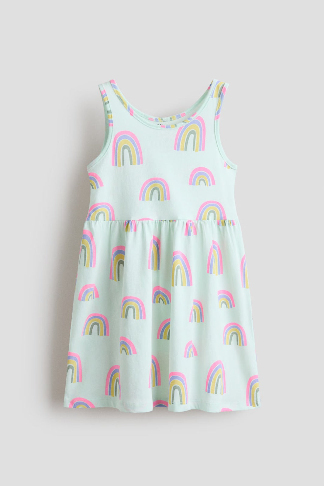Vestido de algodón para niña marca H&M, color aqua con estampado de arcoíris, muy fresco y suave, ideal para la temporada de calor.